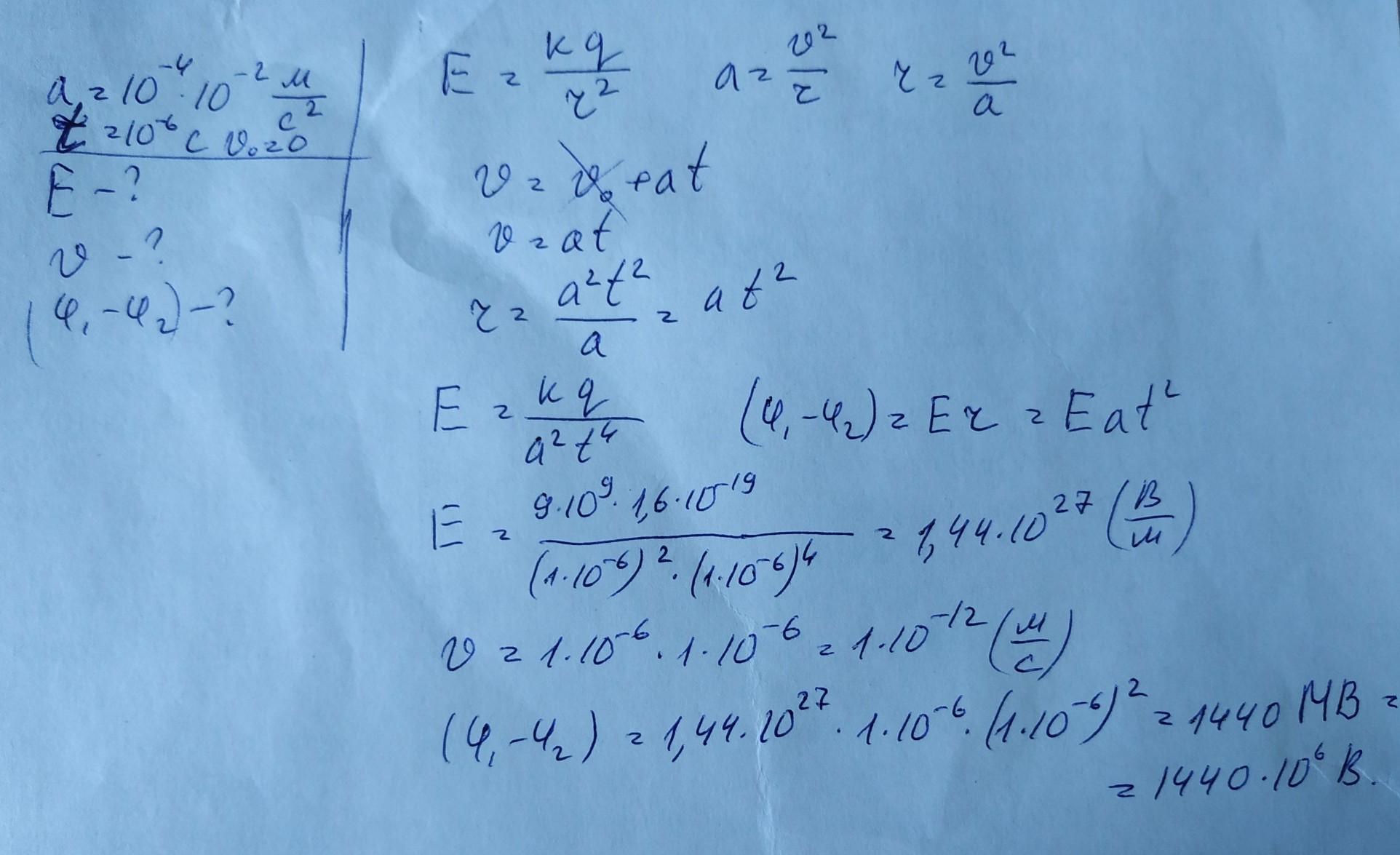 Электрон, находящийся в однородном электрическом поле, получает ускорение, равное a = 10^–14 см/с 2 . Найти: 1) напряженность электрического поля; 2) скорость, которую получит электрон за τ = 10^–6 с своего движения, если начальная скорость его была равна нулю; 3) разность потенциалов, пройденную при этом электроном.