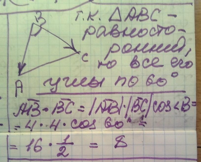 Сторона рівностороннього трикутника ABC дорівнює 4 Знайти скалярний добуток векторів AB - BC.