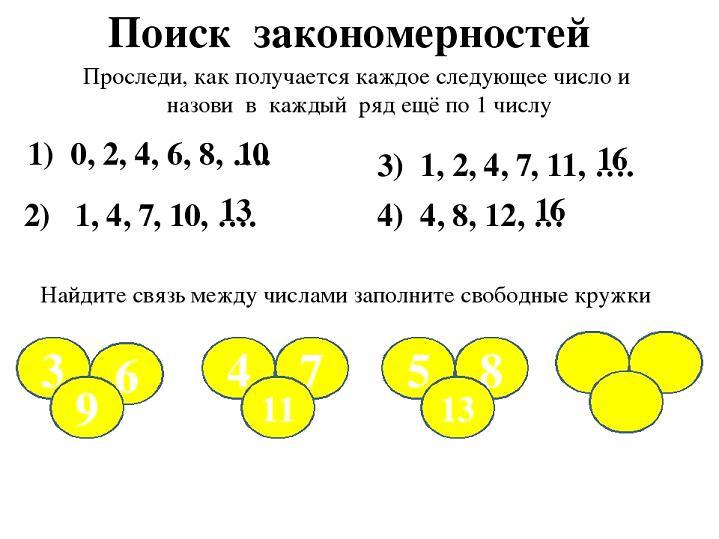 Проследи, как получается каждое следующее число и назови в каждый ряд еще по 1 числу. Найдите связь между числами, заполните свободные кружки.