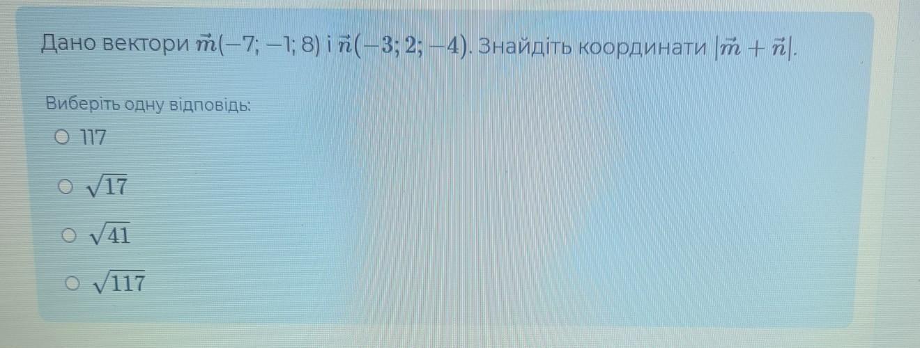 Дано вектори m (-7; -1; 8) і n( - 3; 2; - 4). Знайдіть координати |m+n|.