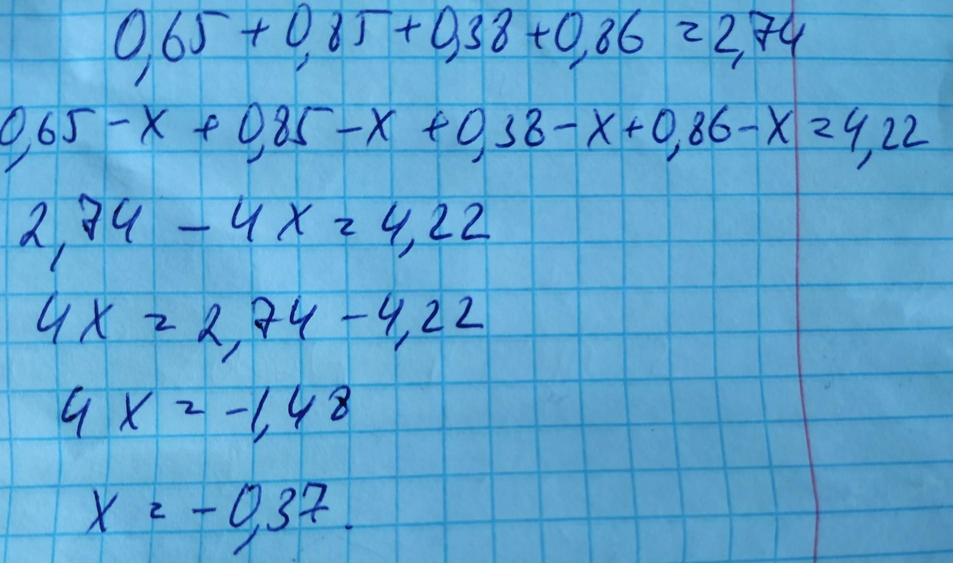 Дана сумма четырех чисел: 0,65 + 0,85 + 0,38 + 0,86. Если мы вычтем все четыре числа на одно и то же число x, сумма станет равной 4,22. Найдите число х.