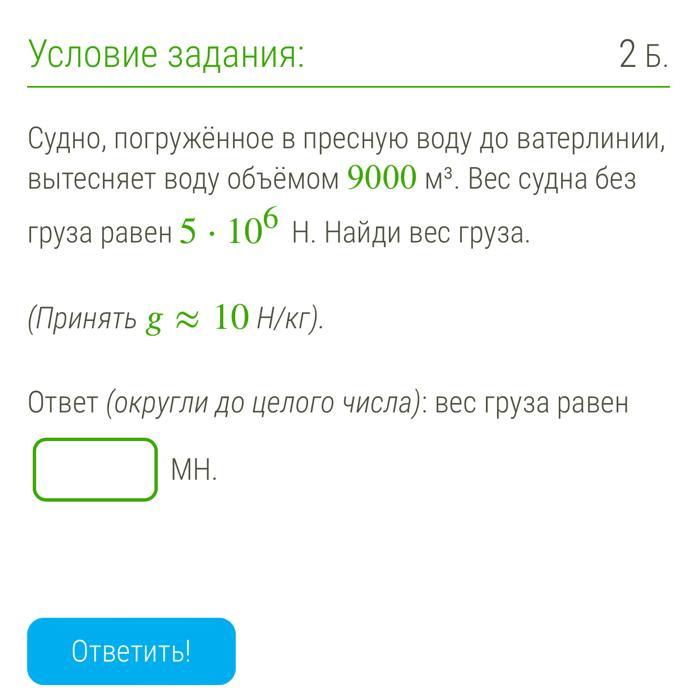 F (выталкивающая сила ) = ро * g * V = 1000 кг/м3 * 10 Н/кг * 9000 м3 = 90 * 10^6 Н.