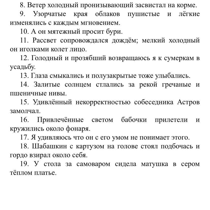 Я буду писать какое слово надо с двух сторон выделить запятыми: , пронизывающий; пушистые и лёгкие; мятежный;мелкий, холодный; голодный и прозябший; полузакрытые; залиты солнцем; удивлённый некорректностью собеседника; привлечённых светом; с его умом; с кутузом на голове; в сером теплом платье;