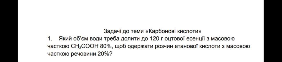 Який об'єм води треба долити до 120 г оцтової есенції з масовою часткою CH3COOH