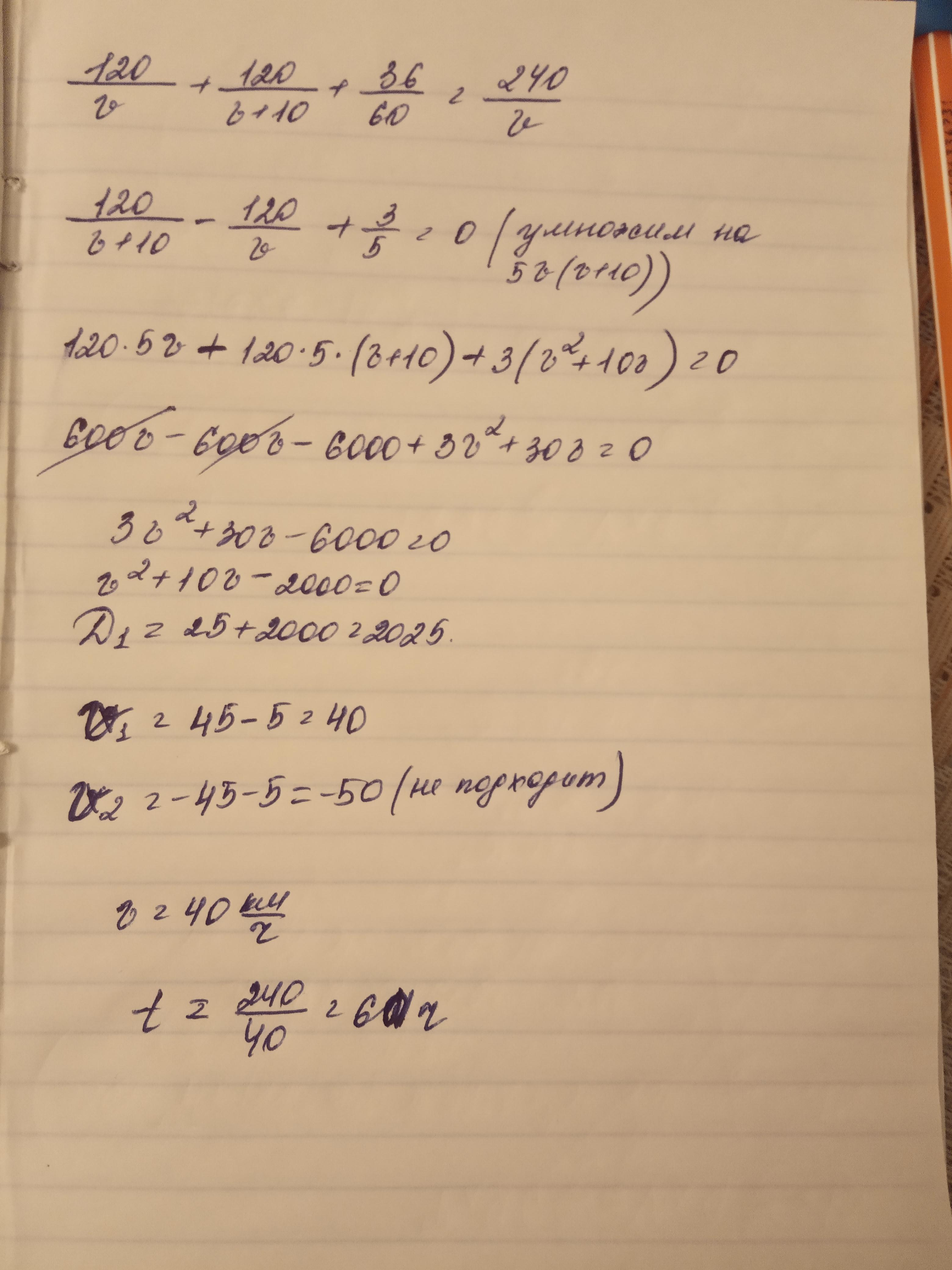 МОТОЦИКЛИСТ ДОЛЖЕН БЫЛ ПРОЕХАТЬ 240 КМ. НО НА ПОЛОВИНЕ ДОРОГИ ОСТАНОВИЛСЯ НА 36 МИНУТ. И ЧТОБЫ ДОЕХАТЬ ВОВРЕМЯ ОН ПОВЫСИЛ СКОРОСТЬ НА 10 КМ/Ч. Сколько времени потратил на дорогу МОТОЦИКЛИСТ?!?!?!?!