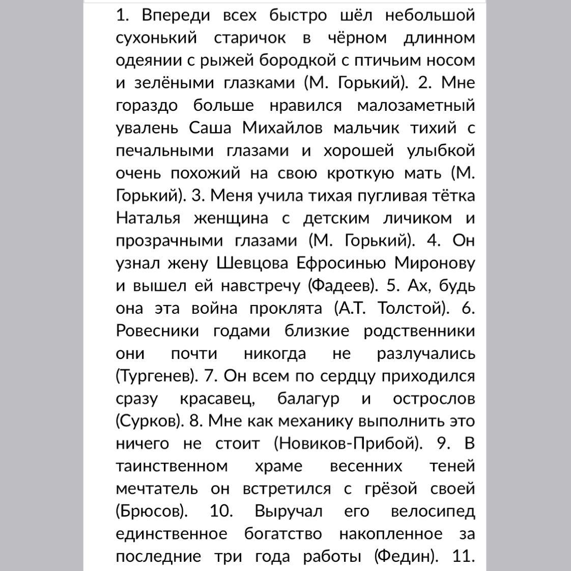 1. Впереди всех быстро шёл небольшой сухонький старичок, в чёрном длинном одеянии, с рыжей бородкой, с птичьим носом и зелёными глазками. 2. Мне гораздо больше нравился малозаметный увалень Саша Михайлов, мальчик тихий, с печальными глазами и хорошей улыбкой, очень похожий на свою кроткую мать. 3. Меня учила тихая, пугливая тётка Наталья, женщина с детским личиком и прозрачными глазами. 4. Он узнал жену Шевцова, Ефросинью Миронову, и вышел ей навстречу. 5. Ах, будь она, эта война, проклята. 6. Ровесники годами, близкие родственники, они почти никогда не разлучались. 7. Он всем по сердцу приходился сразу – красавец, балагур и острослов. 8. Мне, как механику, выполнить это ничего не стоит. 9. В таинственном храме весенних теней, мечтатель, он встретился с грёзой своей. 10. Выручал его велосипед – единственное богатство, накопленное за последние три года работы.