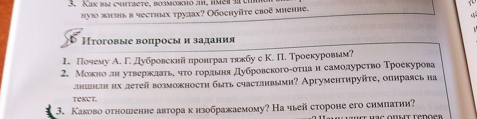 1.Троекуров подкупил судей, и вопрос о тяжбе был решён в его пользу.