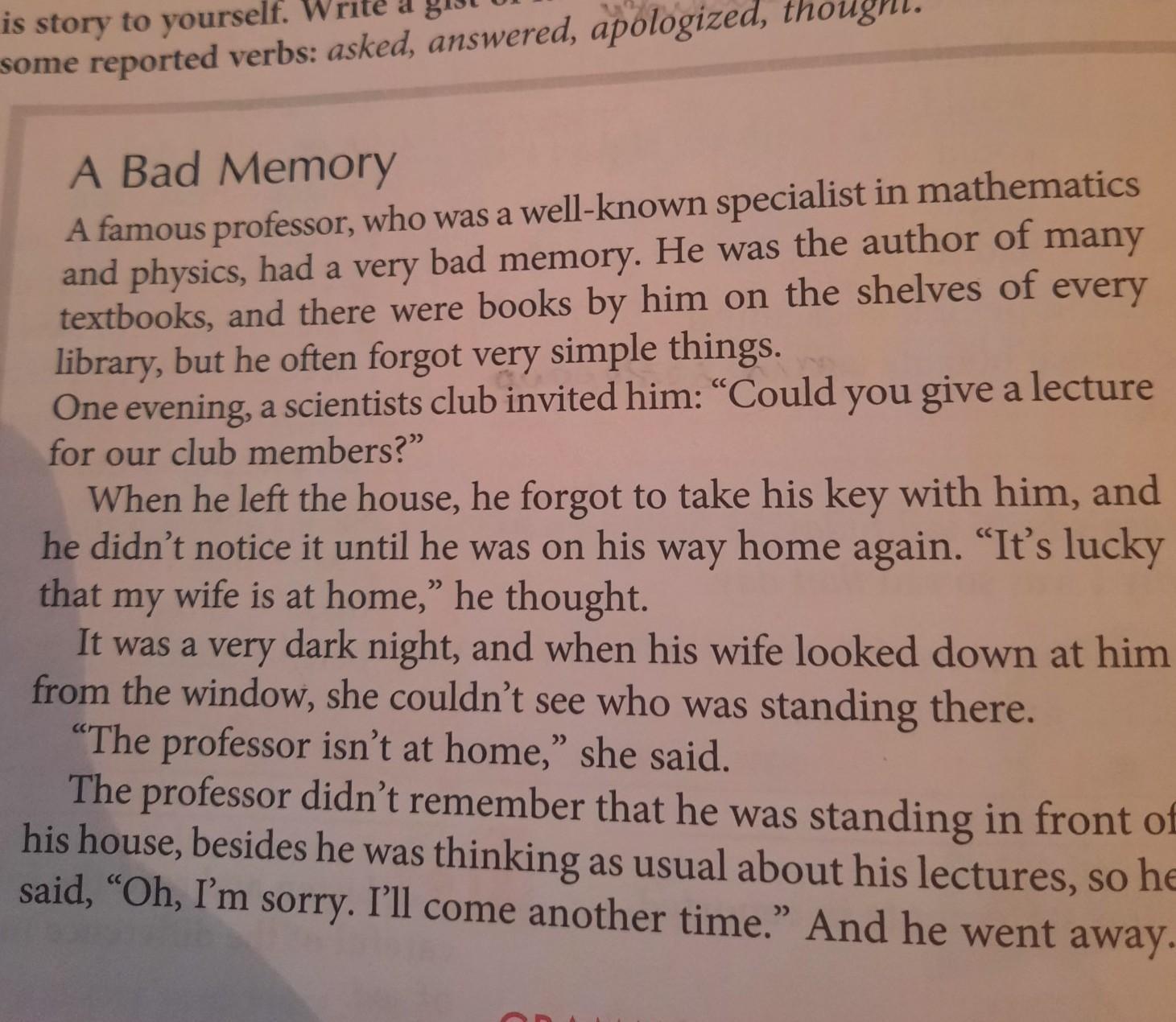 A famous professor, who was a well-known specialist in mathematics and physics, had a very bad memory. When he left the house, he forgot to take his key with, and he didn't notice it until he was on his way home again. It was very dark night, and when his wife looked down at him from the window, she couldn't see who was standing there. The professor didn't remember that be was standing in front of hia house