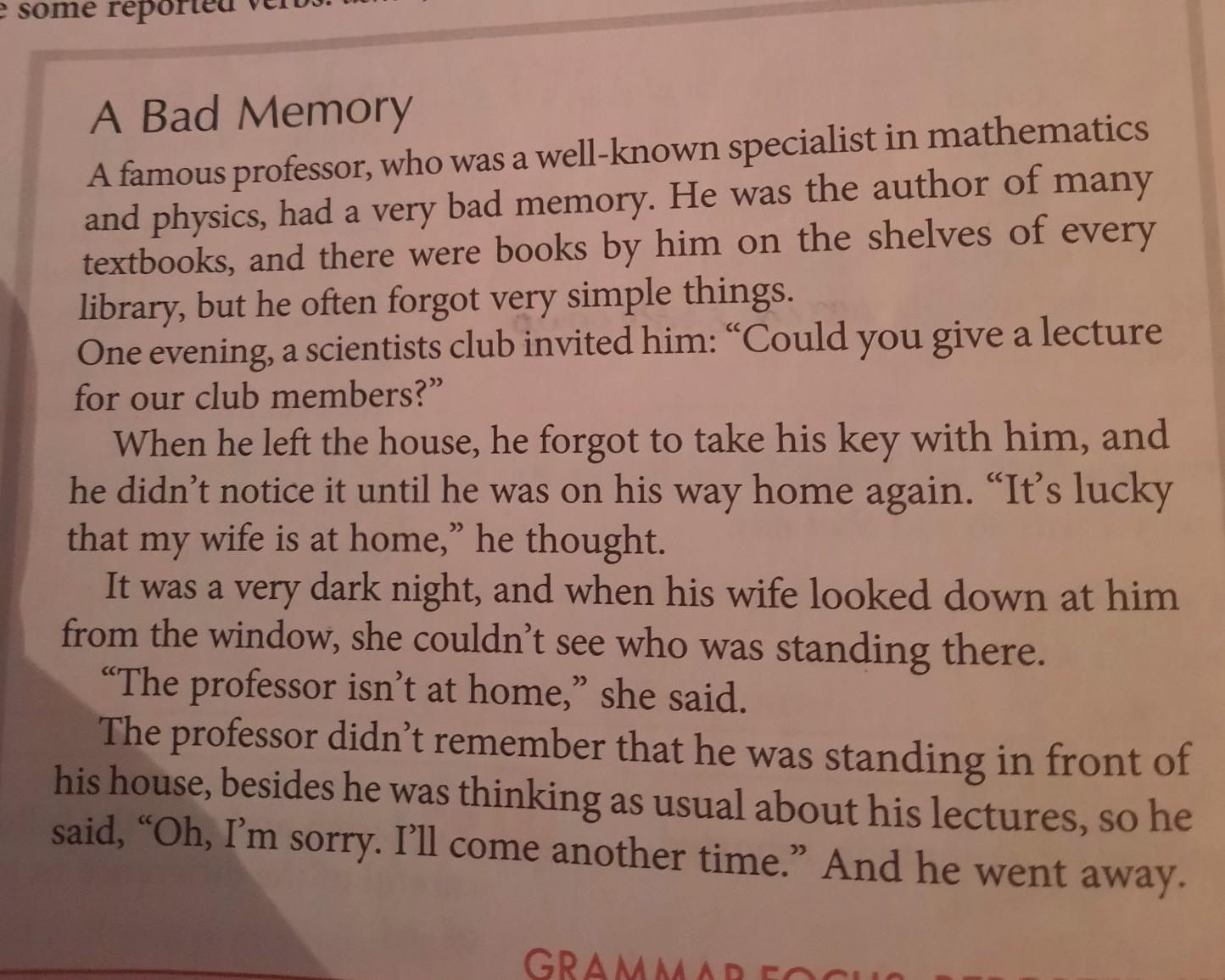 A famous professor who was a good specialist in Maths and Physics had a very bad memory and often forgot very simple things One evening, a scientists club invited him to give a lecture for their club members. When he left the house he forgot to take his key with him.and he didn't notice it until he was on his way home. But he thought that his wife was at home. It was dark and when his wife looked at him from the window she couldn't see who was standing and she said the professor wasn't at home. The professor didn't remember that he was standing in front of his house. He said that he was sorry, he would come another time.