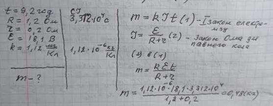 СРОЧНО!!!!!! Розрахуйте кількість срібла, що виділяється на катоді за 9,2 год, якщо опір електроліту між електродами дорівнює 1,2 Ом, джерело струму має ЕРС 18,1 В та внутрішній опір 0,2 Ом? Електрохімічний еквівалент срібла = 1,12 мг/Кл. Відповідь надайте, округливши результат до сотих.