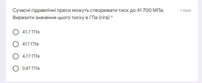 Сучасні гідравлічні преси можуть створювати тиск до 41 700 МПа. Виразити значення цього тиску в ГПа (гіга)