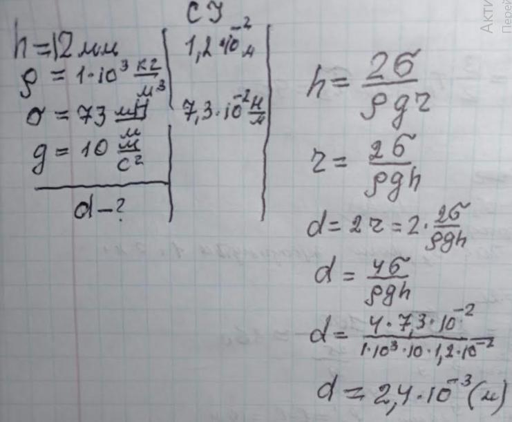 визначіти внутрішній діаметр капілярної трубки, якщо вода в ній піднялась над відкритою поверхнею води на 12мм