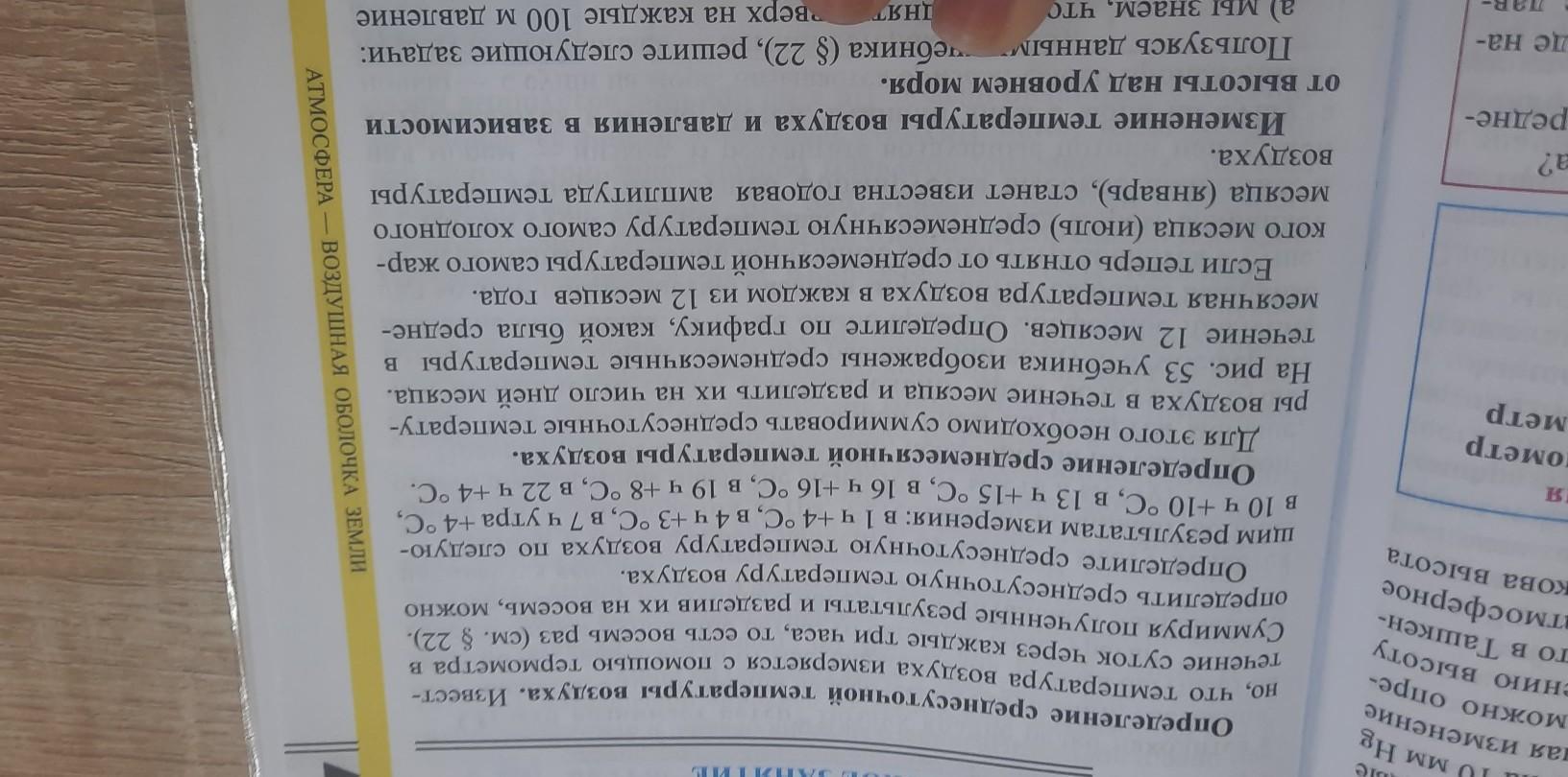 Определение среднесуточной температуры воздуха. Извест- но, что температура воздуха измеряется с помощью термометра в течение суток через каждые три часа, то есть восемь раз (см. 8 22). Суммируя полученные результаты и разделив их на восемь, можно определить среднесуточную температуру воздуха.