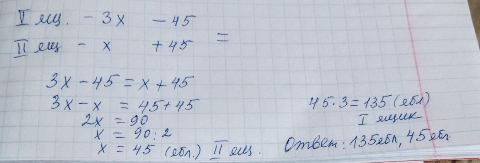 пусть х это 2 ящик тогда 3х это 1 ящик отсюда следует что 3х-45 это 1 ящик после переложения яблок тогда х+45 это 2 ящик после переложения
