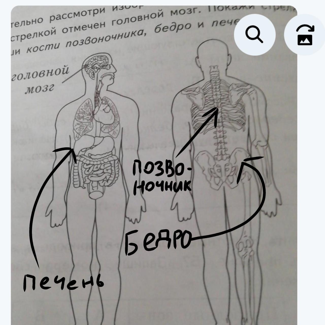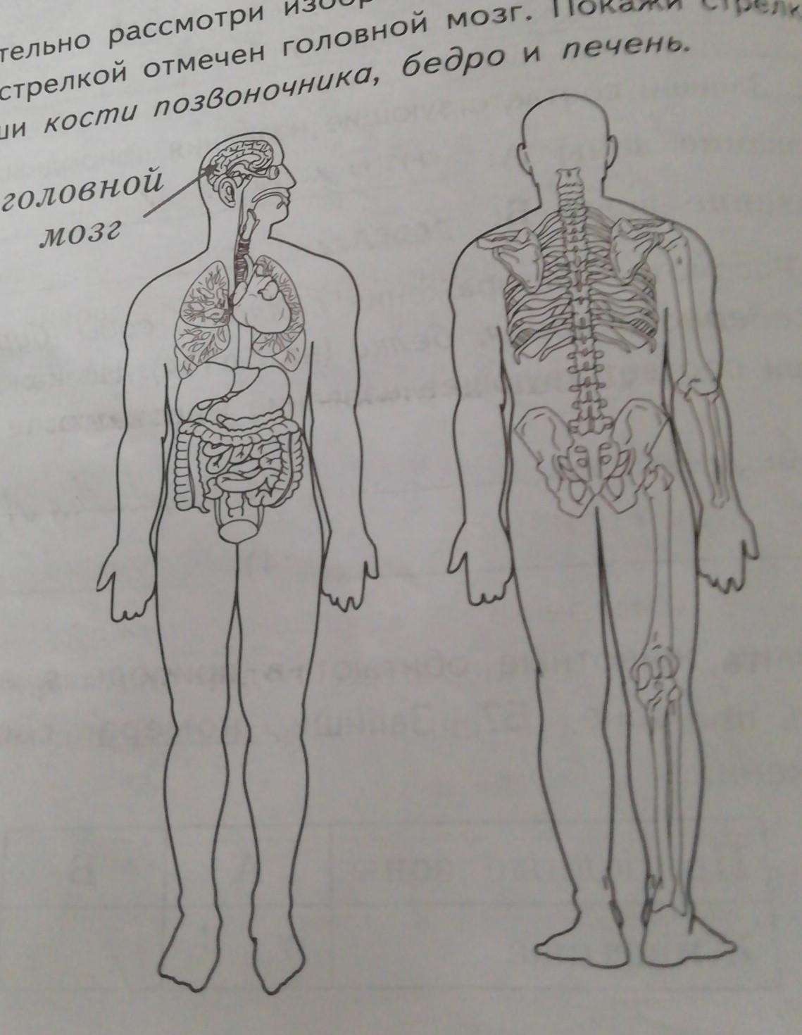 3) внимательно рассмотри изображение тела человека. На сунке стрелкой отмечен головной мозг. Покажи стрелками подпиши кости позвоночника, бедро и печень, головной мозг. Покажи стрелками подпиши кости позвоночника, бедро и печень.