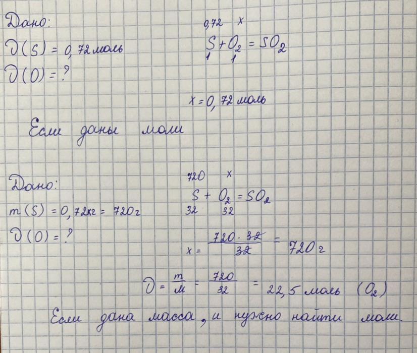 Сколько количества вещества потребуется кислорода для сжигания 0.72 моль серы