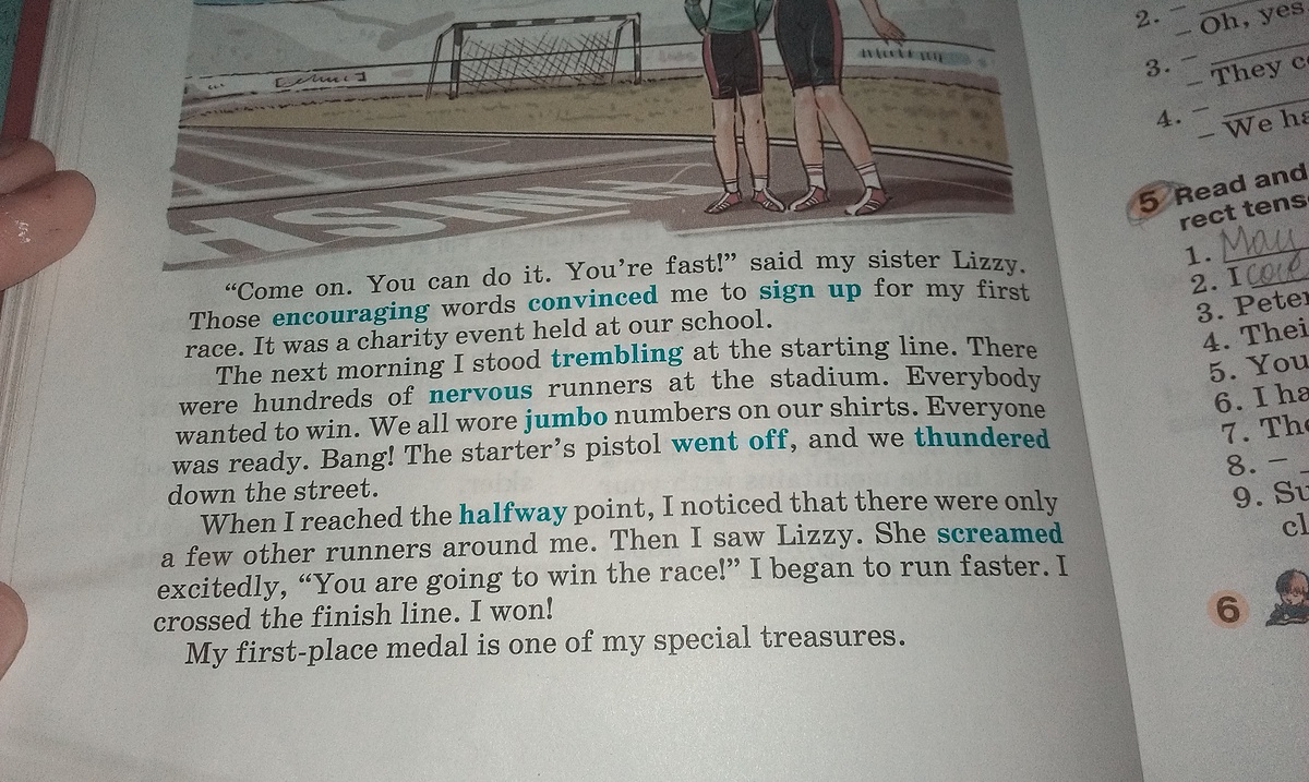 когда я преодалел отметку половины пути, ш заметил что было только несколько бегунов вокруг меня. затем я увидел Лиззи. она кричала в азарте.- ТЫ ВЫИГРАЕШЬ ЗАБЕГ! - я начал бежать быстрее. ш пересек фининшную линию. я выиграл.