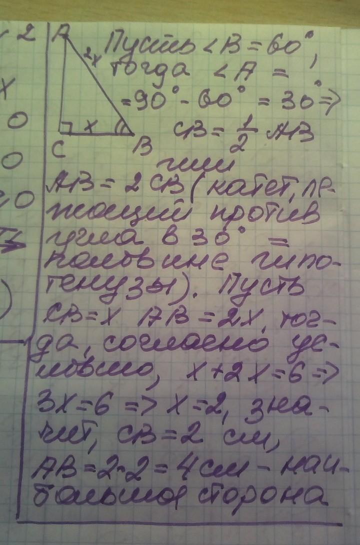 Один із кутів прямокутного трикутника дорівнює 60°, а сума найменшої та найбільшої його сторін 6 см. Знайдіть довжину найбільшої сторони. (Відповідь записати без одиниць вимірювання