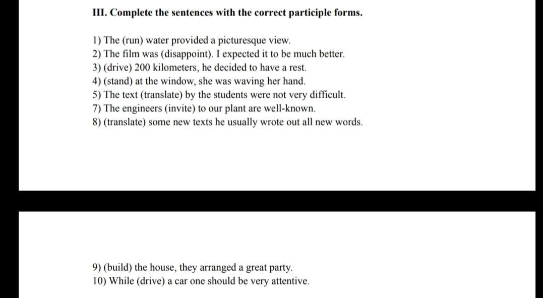 1.The running water... 2.disappointing 3.Having driven 4. While standing 5. translated 7.invited 8. When translating 9. Having built 10. While driving a car...
