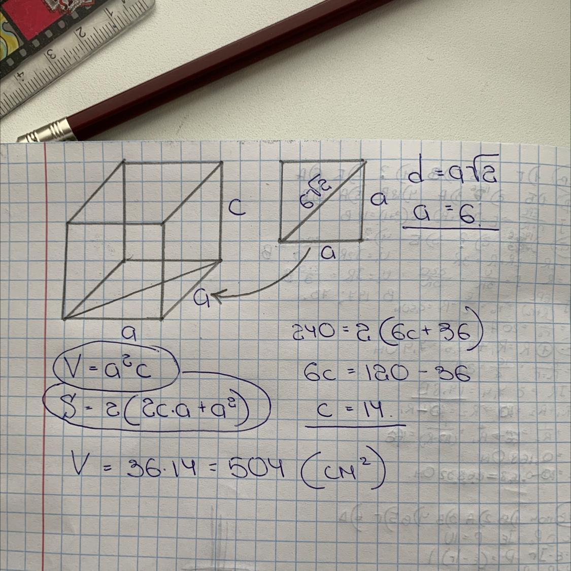 основою прямого паралелепіпеда є квадрат із діагоналлю 6 корінь 2 см. знайдіть обєм паралеліпідп якщо повна поверхня дорівнює 240 см