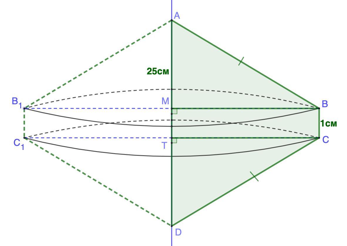 100 баллов : Рівнобічну трапецію з основами 1 см і 25 см обертають навколо прямої, що містить її більшу основу. Знайдіть об’єм отриманого тіла, якщо відомо, що в дану трапецію можна вписати коло.