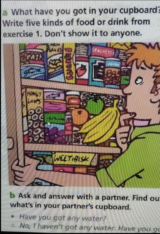 I have bananas, apple, orange, cereal, jam and spagetti in my cupboard