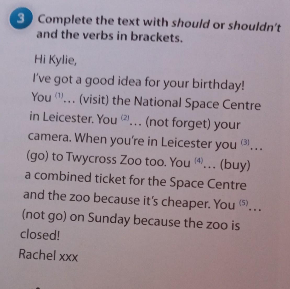 I've got a good idea for your birthday! You should visit the National Space Centre in Leicester. You shouldn't forget your camera. When you're in Leicester you should go to Twycross Zoo too. You should a combined ticket for the Space Centre and the zoo because it's cheaper. You shouldn't on Sunday because the zoo is closed!