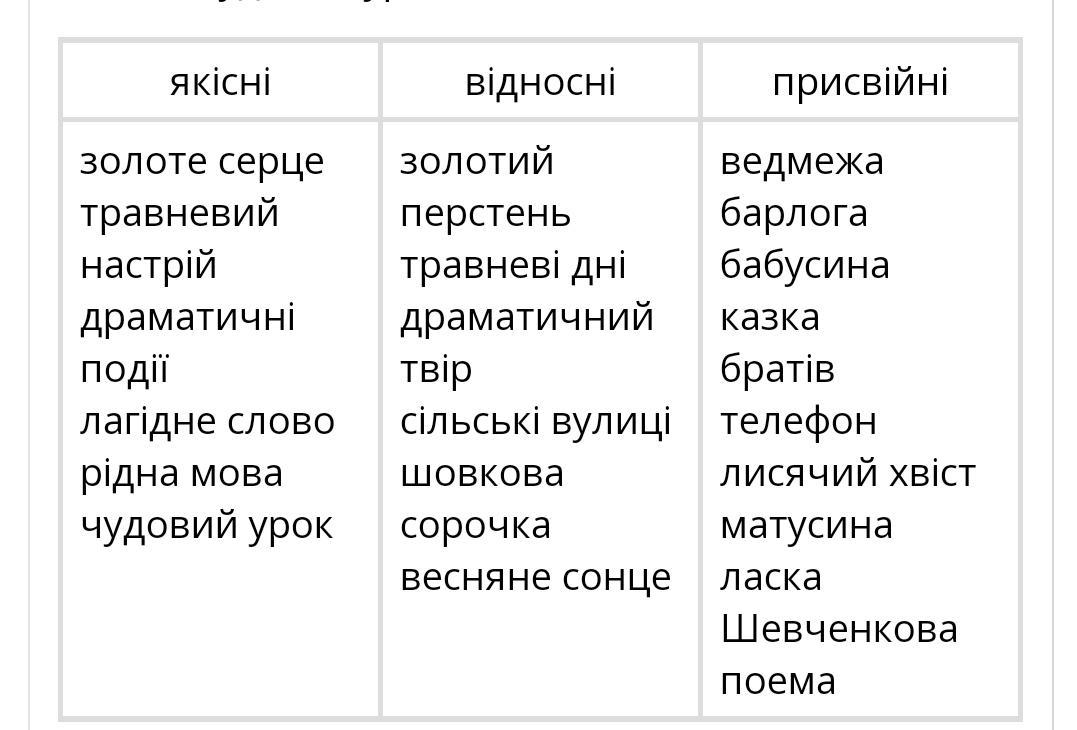 Розподільний диктант. Записати словосполучення у три колонки за групами. якісні відносні присвійні Золотий перстень, золоте серце, ведмежа барлога, травневі дні, травневий настрій, драматичний твір, драматичні події, бабусина казка, сільські вулиці, шовкова сорочка, братів телефон, лагідне слово, лисячий хвіст, матусина ласка, рідна мова, весняне сонце, Шевченкова поема, чудовий урок .