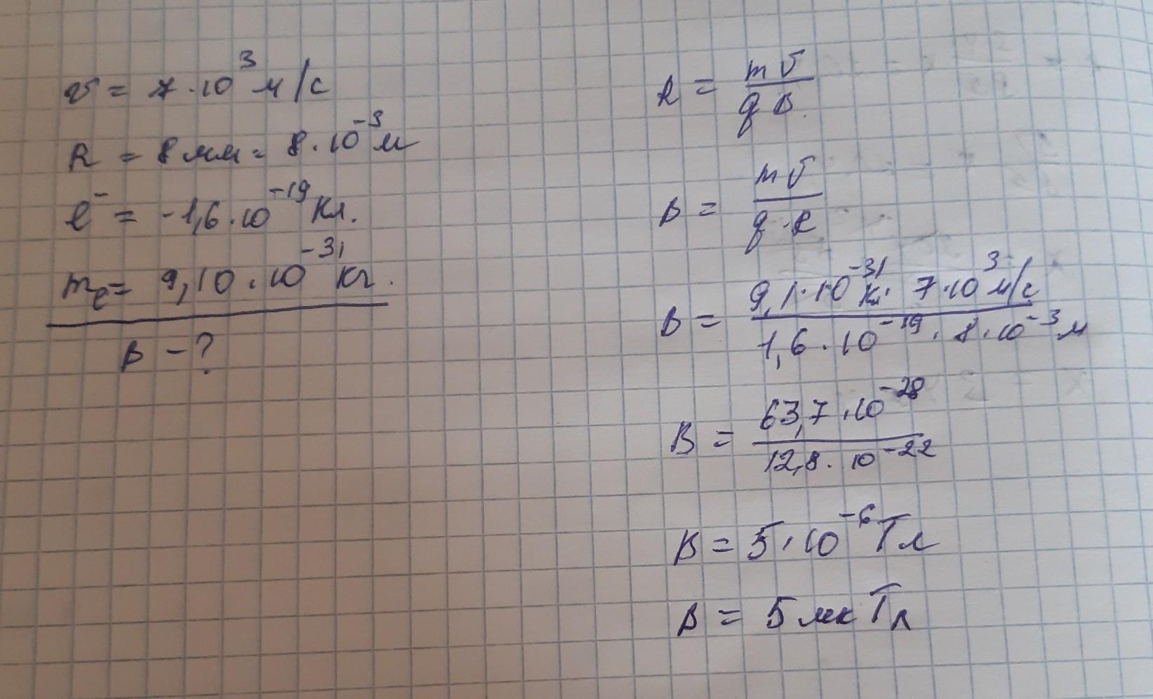 індукцію магнітного поля, якщо швидкість електрона рівна 7·103 м/с.