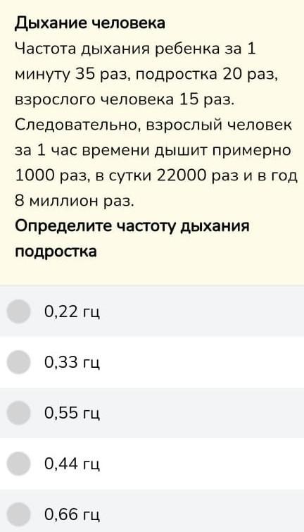 Частота дыхания (смена вдоха и выдоха и дыхательной паузы) – количество дыханий в одну минуту. Определение частоты дыхания производится по спирограмме или движению грудной клетки. Средняя частота дыхания у здоровых подростков 15-16 лет – 16-18 в минуту, у спортсменов – 8-12.