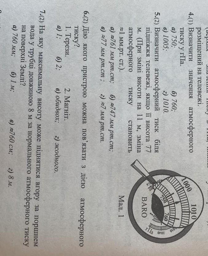 7)На яку максимальну висоту може піднятися вгору за поршнем вода у трубщі довжиною 8 м за нормального атмосферного тиску на поверхні Землі?