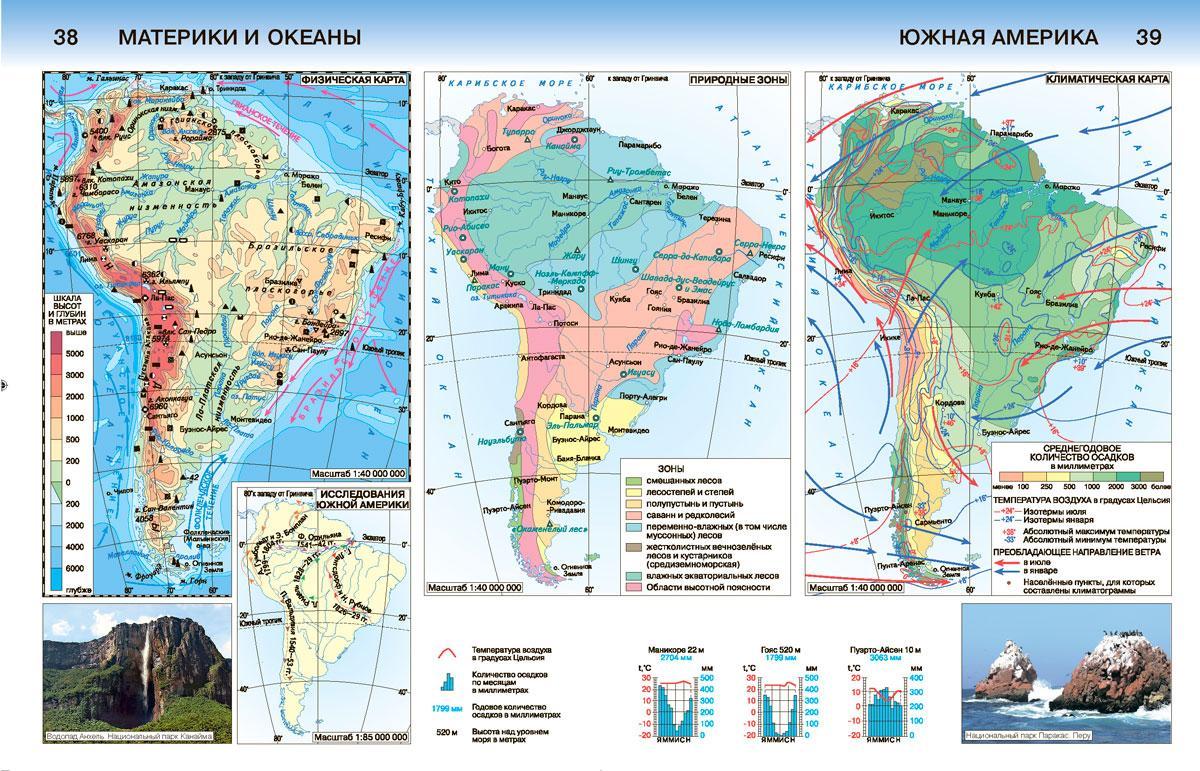 Крупные формы рельефа: это Анды сама большая горная цепь, самая высокая точка анд это гора Аконкагуа! Потом, низменности: Амозонская низменность, самая большая которая названа в честь самой длинной река в Ю. Америке амозонки! Так на втором месте Низменность Ла-Платская они выделяются залёным цветом, а анды можно выделить красным они проходят по всей южной америке! Пласкогорья; Самое большое это Бразильское пласкогорье, Названо в честь бразилии он находится там! И так осадки, в северной полушарии осадков более 3000, в центре более 1000, в заподном 2000, и в южном более 500. Страны и столицы в северном полушарии Каркас- венусуэла, джорджтаун-гайана, санта-фе-де-богота- это колумбия, в южном полушарии аргентина- буэнос айрес-, Чили- Сантьяго, центр один большой это Бразилия- Бразилия, восточное полушарие, ургувай-монтевидео, и западное- перу-лима, ла-пас это боливия
