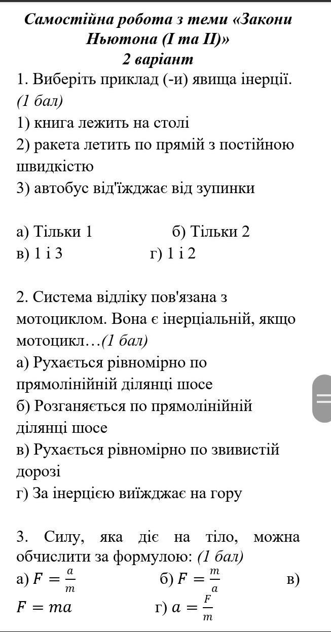 1)Г) оскільки інерціальна система відліку бере до уваги нульове прискорення(стан спокою або рівномірний рух),то нам підходить варіант з книжкою та ракетом,а з автобусом ні,бо він може мати прискорення,про яке не сказано