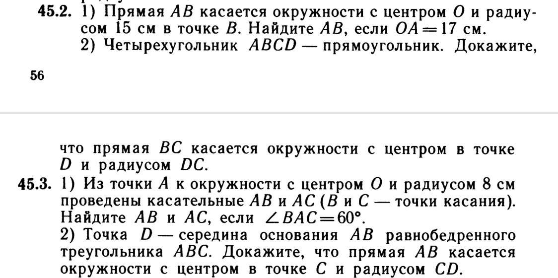 Ответ:45.2 1) 8 . 2) так как авсдпрямоугольник то всд равен 90 градусов тогда радиус перпендикулярен ВС тогда вс касается окружности с центром в точке Д 45.3) 1) квадратнфй корень из числа 192. 2) так как треугольник авс рб тогда в нем отрезок сд совпадет с медианой и высотой так как он рб тогда радиус сд перпендикулярен ав тогда ав касается окружности в точке д с центром в точке с..... подробно лень писать