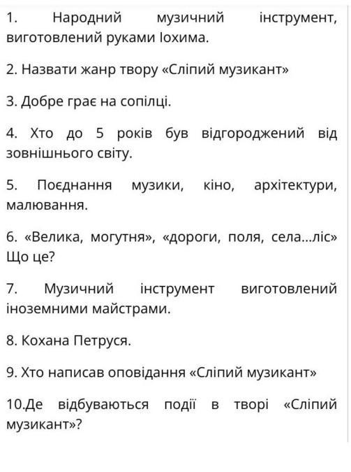 1. Сопілка 2. Повість. 3. Іохим. 4. Петрусь. 5.незнаю 6.теж 7.ні 8. Евеліна 9.володимир короленко. 10. Вибач