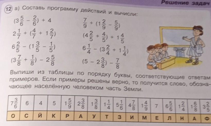 Выпиши из таблицы по порядку буквы, соответствующие ответам примеров. Если примеры решены верно, то получится слово, обозна- чающее населённую человеком часть Земли.