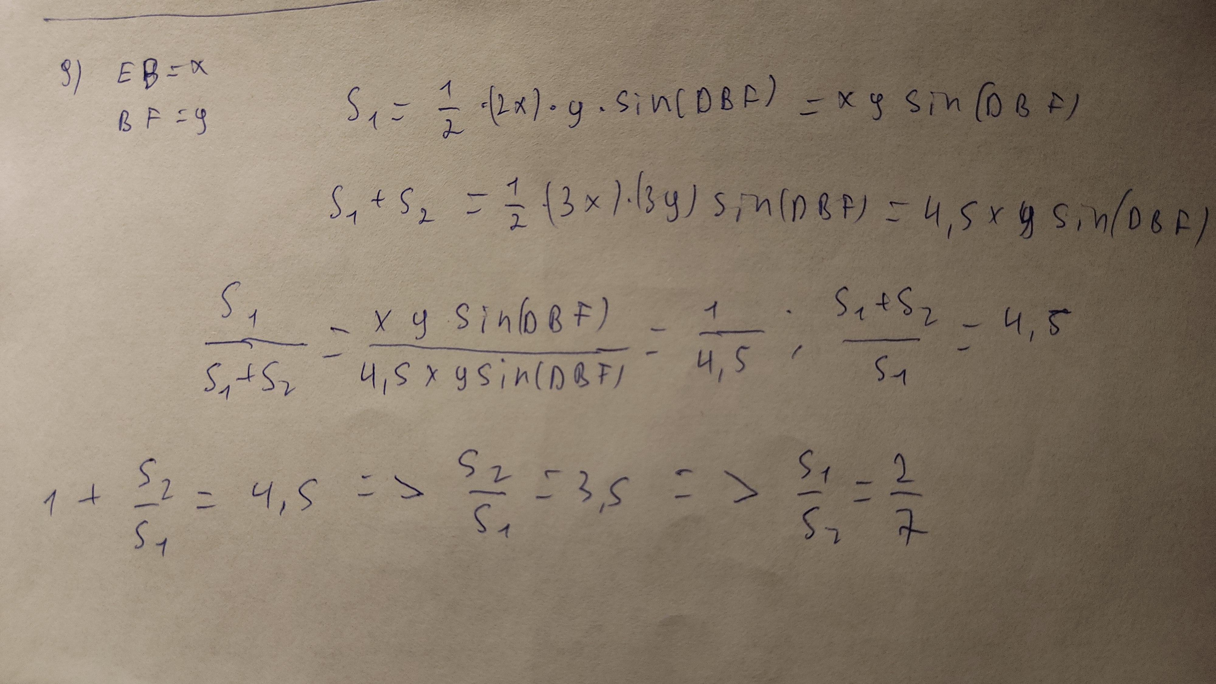 То есть площади равны. Аналогичным образом получим, что площади треугольников ADB и CDB равны (S_ADB=S_CDB). Из двух равенств следует, что S1=S2, то есть S1/S2=1