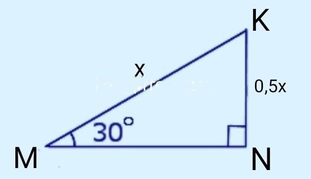 2. В прямоугольном треугольнике напротив угла в 30° лежит катет NK, равный половине гипотенузы MK. Пусть MK = x мм, тогда NK = 0,5•x мм, по условию