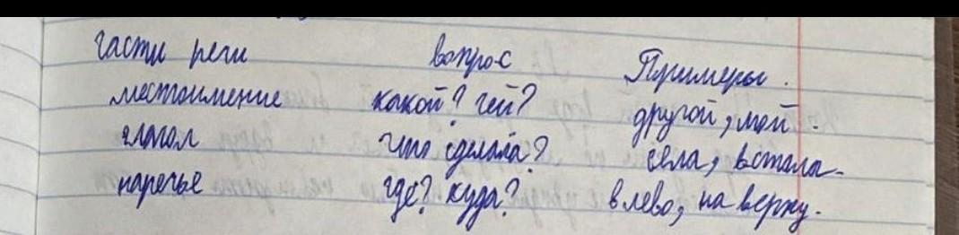 Перечертите таблицу в тетрадь и заполните её. Какие части речи не отвечают на вопросы? Почему?