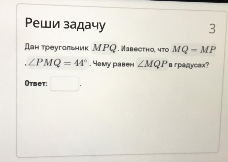 Так как MQ = MP ⇒ треугольник MPQ - равнобедренный ⇒ ∠MQP=∠MPQ, тогда ∠MQP + ∠MPQ = 180° - 44° = 136° ⇒ ∠MQP=136°/2=68°