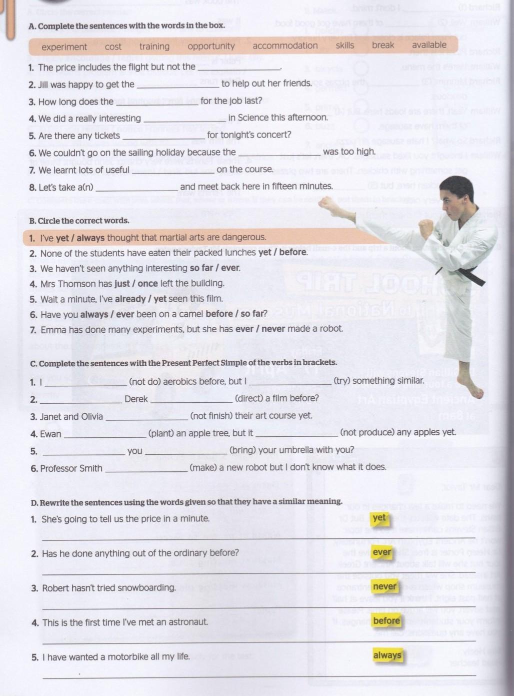 1. accommodation 2. opportunity 3. training 4. experiment 5.available 6.cost 7.skills 8.break