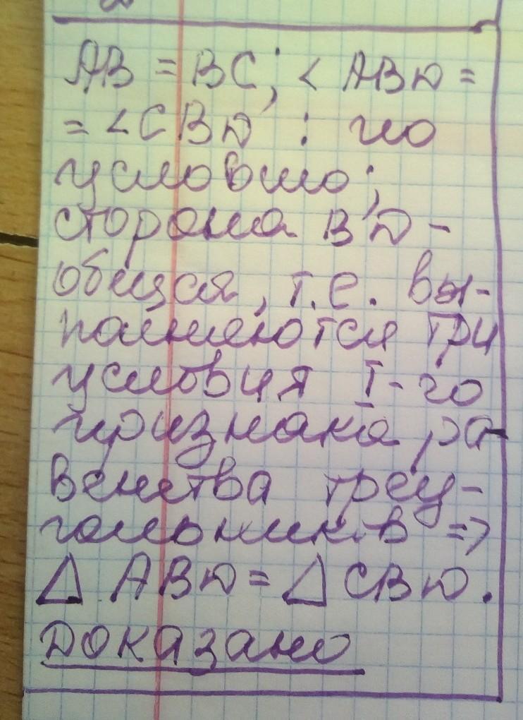 Доведіть рівність трикутника АВD і CBD(мал.),якщо AB=CB і кутABD=кутCBD
