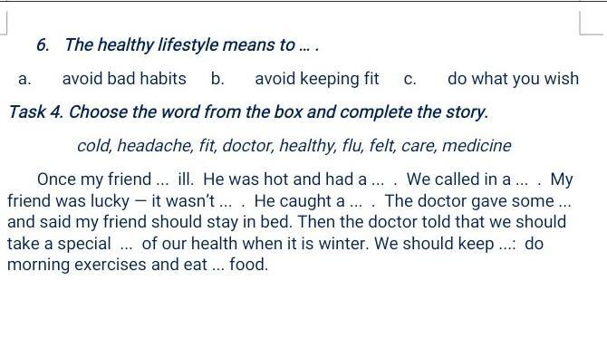 1 - fit ill, 2 - headache, 3-doctor, 4 -felt, 5-flu , 6-cold, 7-medicine, 8-care, 9-healthy
