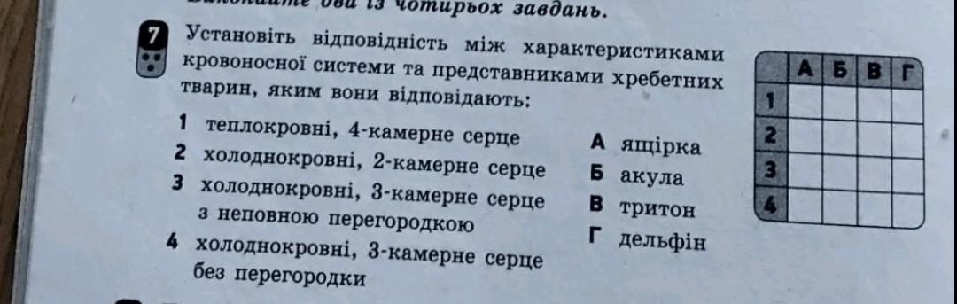 Установіть відповідність між характеристиками кровоносної системи та представниками хребетних тварин яким вони відповідають:ящірка,акула,тритон,дельфін
