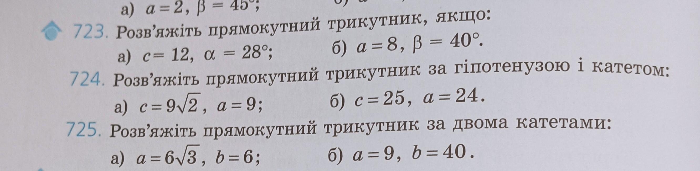 723а) Cтандартные обозначения : а - катет, лежащий против ∠А , b - катет, лежащий против ∠В , с - гипотенуза , ∠А=α , ∠В=β . Так как треугольник прямоугольный, то углы α и β будут острыми .