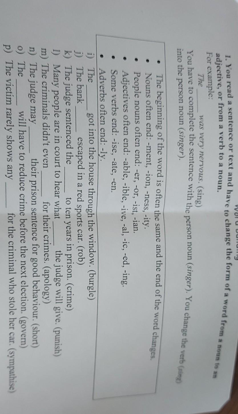 1. You read a sentence or text and have to change the form of a word from a noun to an Word building adjective, or from a verb to a noun. For example: The was very nervous. (sing) You have to complete the sentence with the person noun (singer). You change the verb (sing) o The beginning of the word is often the same and the end of the word changes. Nouns often end:-ment, -ion, -ness, -ity. People nouns often end: -er, -or, -ist, -ian. Adjectives often end: -able, -ible, -ive, -al, -ic, -ed, -ing. Some verbs end: -ise, -ate, -en. Adverbs often end: -ly. got into the house through the window. (burgle) escaped in a red sports car. (rob) k) The judge sentenced the to ten years in prison. (crime) 1) Many people are in court to hear what the judge will give. (punish) m) The criminals didn't even for their crimes. (apology) n) The judge may their prison sentence for good behaviour. (short) will have to reduce crime before the next election. (govern) p) The victim rarely shows any for the criminal who stole her car. (sympathise) i) The j) The bank 0) The