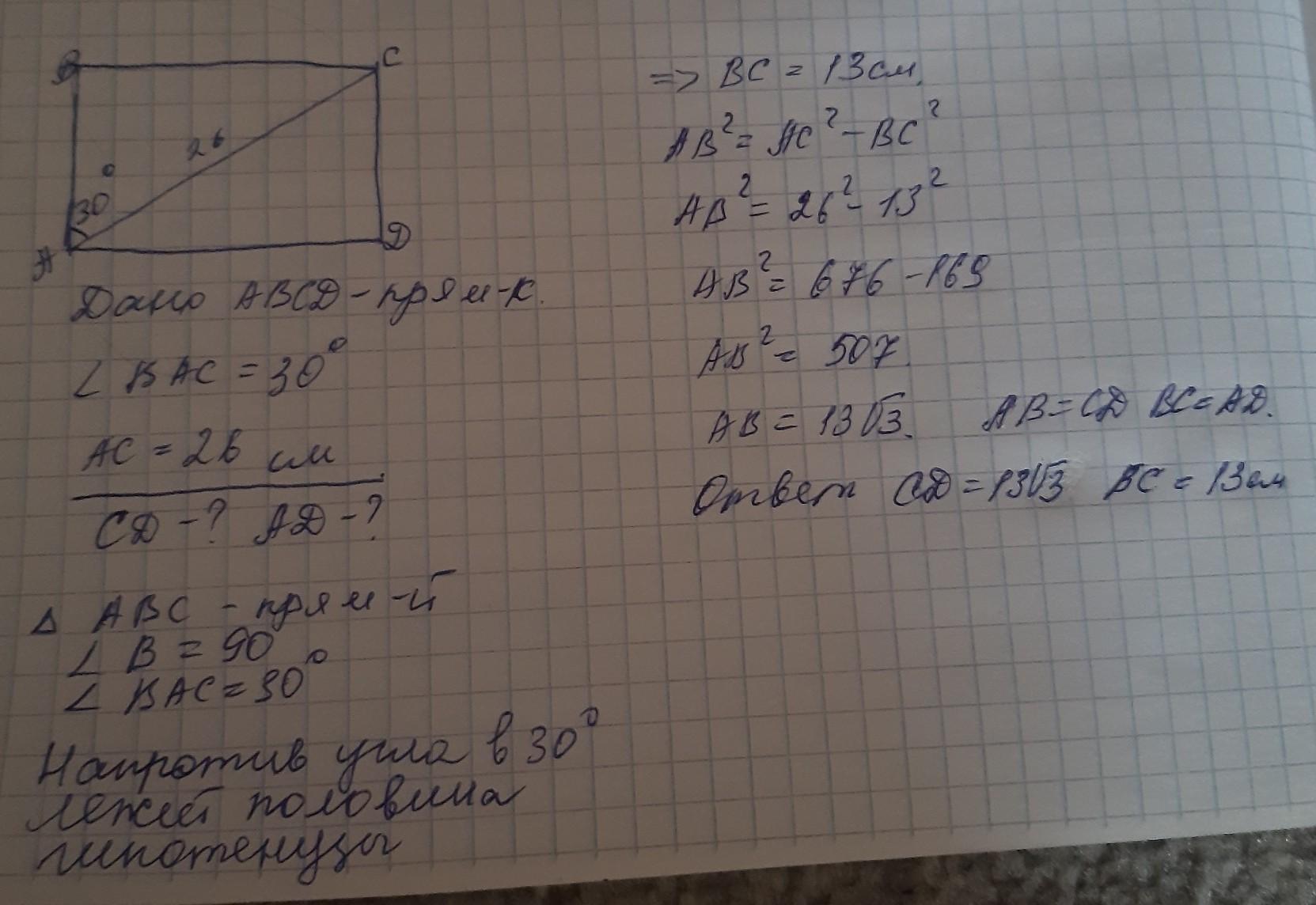 Діагональ прямокутника abcd дорівнює 26 см і утворює із стороною ab кут 30°. Знайдіть сторони cd і ad прямокутника.
