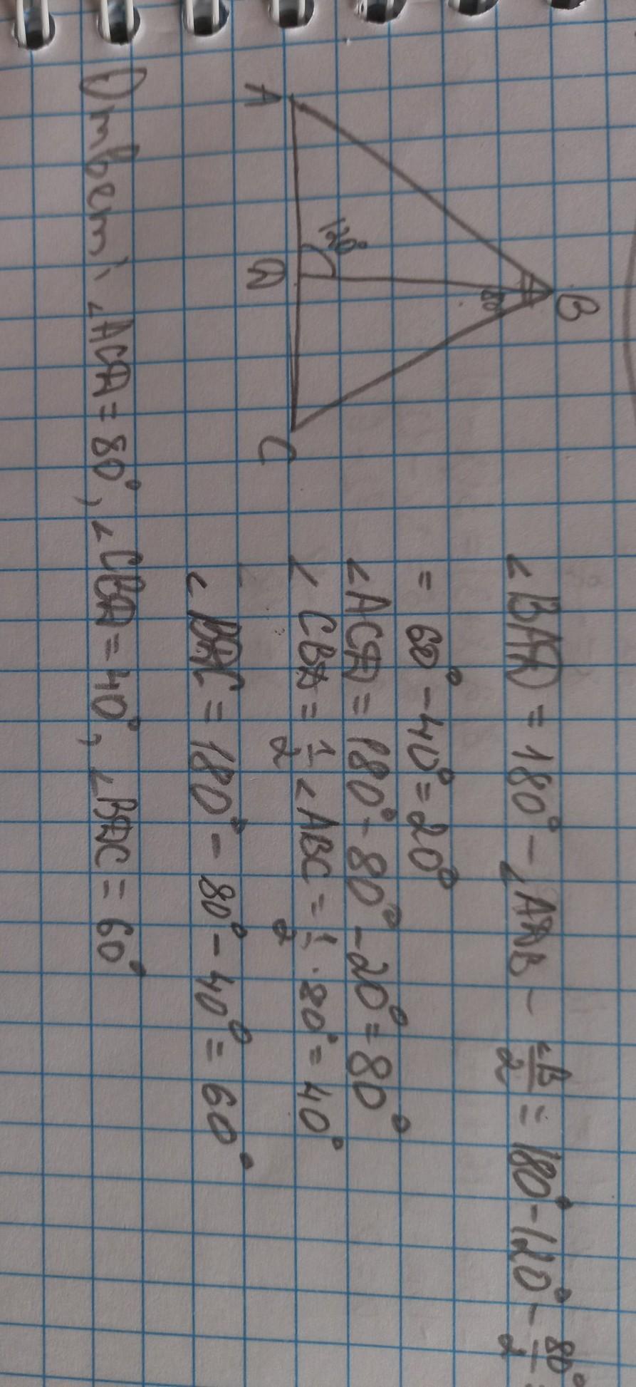 В треугольнике ABC проведена биссектриса BD. Угол ADB равен 120 градусов, угол B равен 80 градусов. Найти углы треугольника CBD