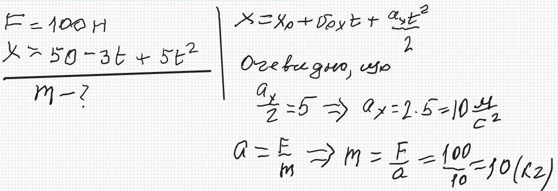 Тіло рухається вздовж осі ОХ під дією постійної сили 100 Н. Координата тіла змінюється за законом х=50-3t+5t^2. Якою є маса тіла?