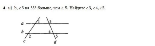 ∠3+∠5=180, учитывая условие (∠5+38)+∠5=180° ⇒∠5=71°